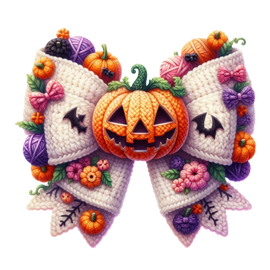 A whimsical Halloween bow featuring a smiling pumpkin, decorated with colorful yarns, flowers, and playful bat accents. dtf prints