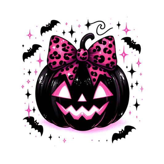 A stylish black pumpkin with a vibrant pink leopard-print bow, featuring playful facial features, perfect for Halloween decor! heat press transfers