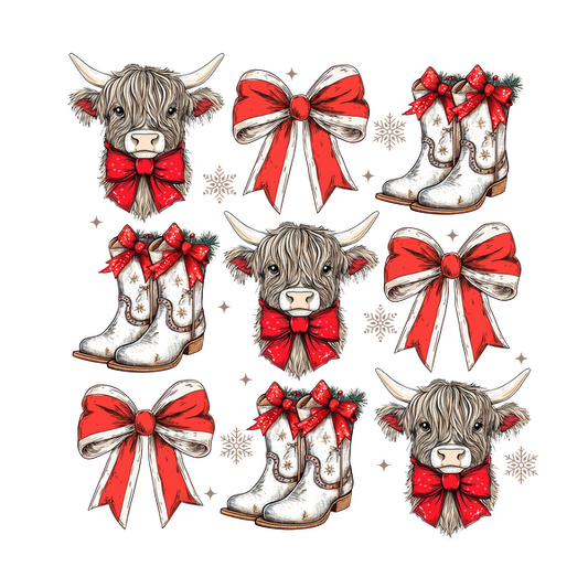 A charming illustration featuring Western boots, festive bows, and Highland cow heads, all adorned with red ribbons and holiday flair. dtf prints