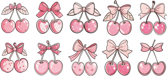 A colorful collection of cute pink cherry illustrations, each adorned with lovely bows and varying patterns.UV Transfers dtf prints