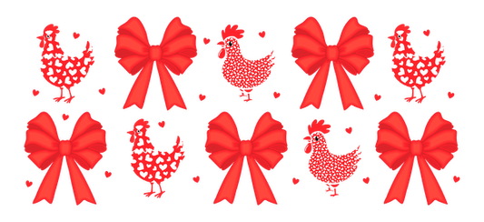 A red bow with some chickens on it.UV Transfers