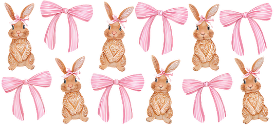 A charming collection of decorative bunny cookies adorned with pink bows and intricate icing designs, perfect for festive occasions.UV Transfers dtf prints