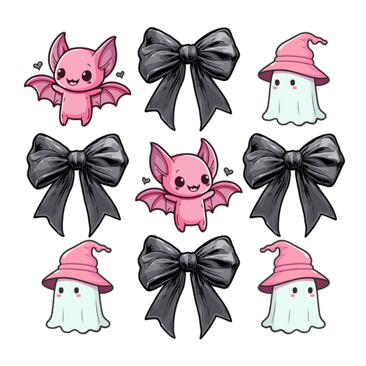 A playful pattern featuring cute pink bats, adorable ghosts, and stylish black bows, perfect for a whimsical Halloween theme.dtf regular iron