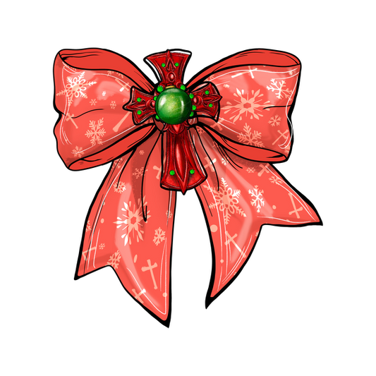 A festive red bow adorned with white snowflakes and a green centerpiece, perfect for holiday decorations.dtf regular iron
