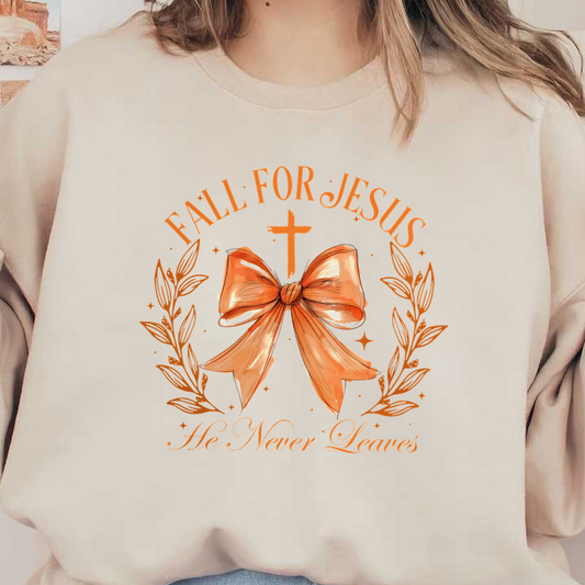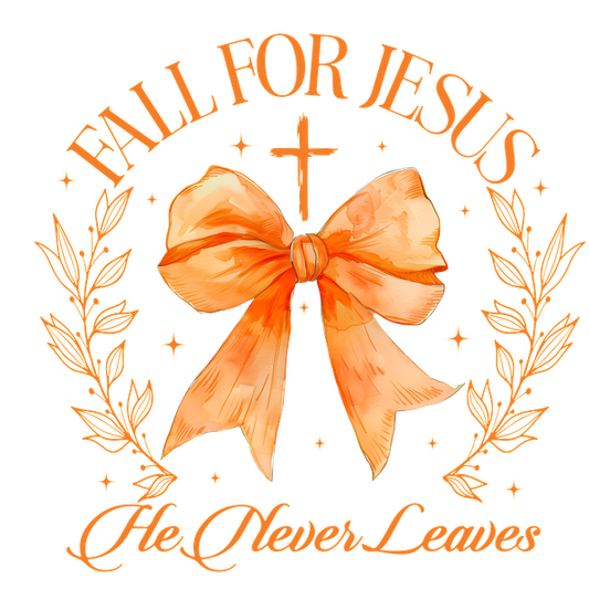 A beautiful graphic featuring an orange bow surrounded by floral elements, highlighting the message "Fall For Jesus, He Never Leaves." dtf transfers