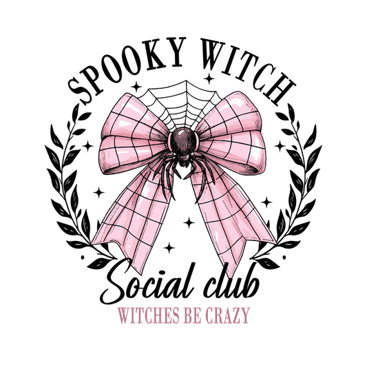 A whimsical pink bow with a spider, complemented by a web, featuring the phrase "Witches Be Crazy" below. heat press transfers