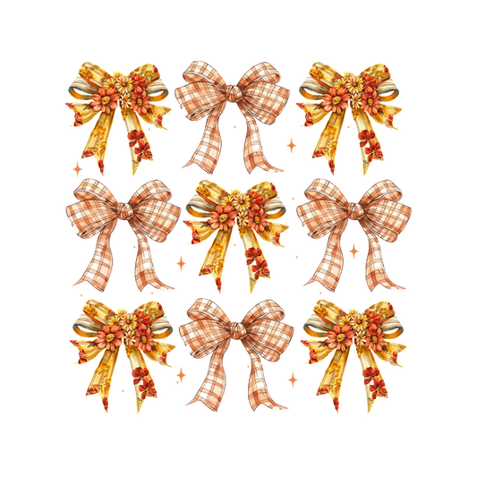 A charming collection of nine festive bows in warm autumn colors, adorned with plaid patterns and decorative embellishments. dtf prints