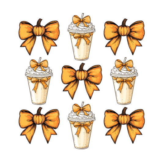 A delightful arrangement of illustrated pumpkin spice latte cups adorned with orange bows and cute pumpkin embellishments. heat press transfers