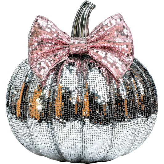 A glittering silver pumpkin adorned with a charming pink sequin bow, perfect for festive decor. dtf prints