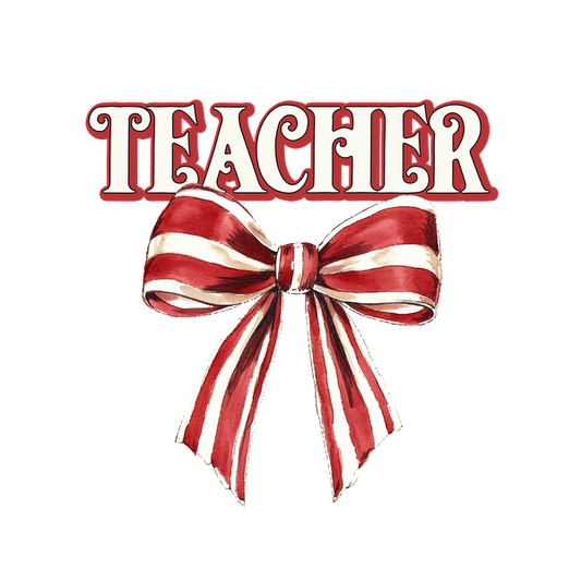 A vibrant design featuring the word "TEACHER" accented by a playful red and white striped bow. dtf transfers