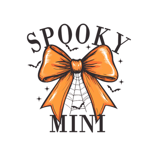 A vibrant orange bow with a web design, accompanied by the text "SPOOKY MINI," perfect for Halloween-themed decor. dtf prints
