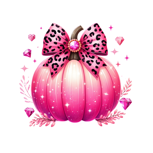 A glamorous pink pumpkin adorned with a leopard-print bow and sparkling gems, perfect for stylish autumn decor! heat press transfers