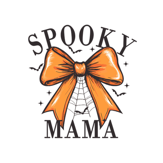 A playful design featuring an orange bow and the text "Spooky Mama," perfect for Halloween celebrations. heat press transfers