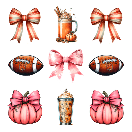 A fun collection of autumn-themed illustrations featuring ribbons, pumpkins, footballs, and a cozy drink, perfect for seasonal decor. dtf prints