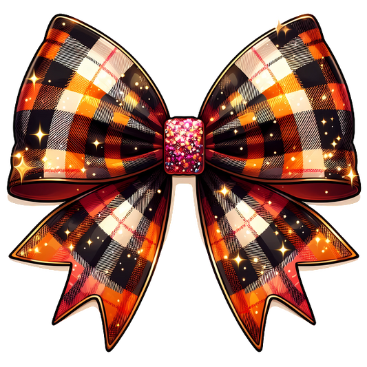A vibrant, plaid bow in orange, black, and cream hues, adorned with a sparkling pink center for a festive touch. dtf transfers