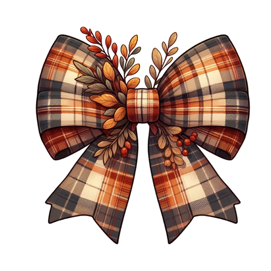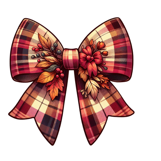 A vibrant, plaid bow adorned with autumn leaves and flowers, perfect for adding a seasonal touch to any decoration. heat press transfers