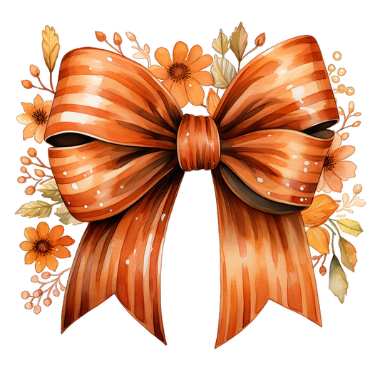 A vibrant orange bow with a pumpkin, surrounded by leafy accents, exuding cheerful autumn vibes. dtf prints