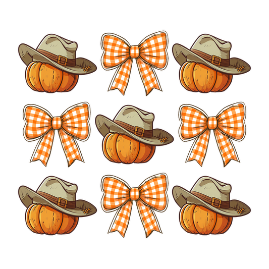 A cheerful set of nine autumn-themed illustrations featuring pumpkins, hats, and checkered bows in warm orange tones. dtf transfers