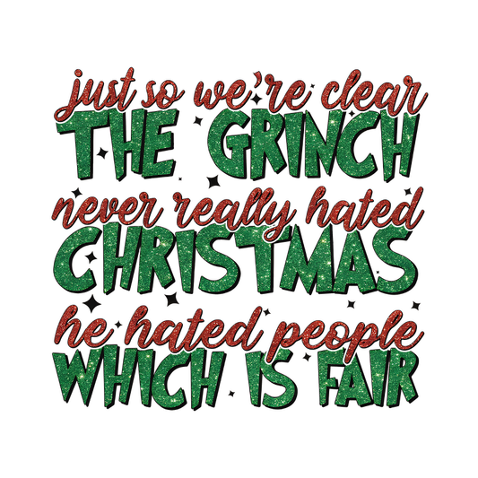 A festive design featuring a humorous take on The Grinch's feelings towards Christmas and people, with vibrant green and red lettering.DTF Transfersdtf regular iron dtf transfers
