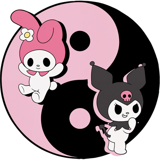 A playful design featuring two cute characters, My Melody in pink and Kuromi in black, against a yin-yang backdrop.DTF Transfers dtf prints