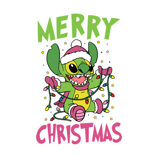 Celebrate the holidays with this colorful, playful illustration of Stitch in festive attire, spreading cheer and joy!UV Transfersdtf regular iron