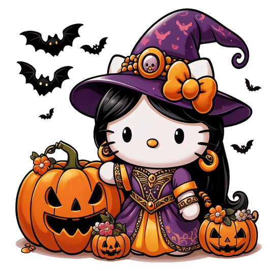 This adorable Halloween-themed Hello Kitty is dressed as a witch in a purple gown, surrounded by playful pumpkins and bats.DTF Transfers