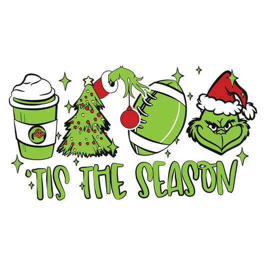 Celebrate the holiday spirit with this playful graphic featuring a festive drink, Christmas tree, football, and the Grinch!DTF Transfers heat press transfers heat press transfers