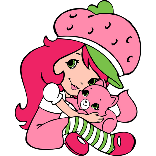 A cheerful cartoon girl with pink hair and a strawberry hat hugs her cute pink kitten, showcasing a playful and colorful style.DTF Transfers
