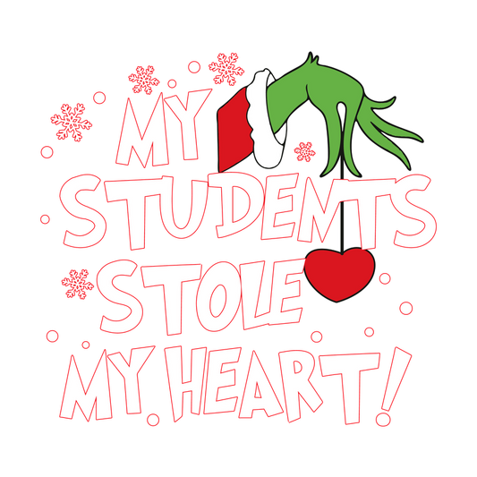 A festive and playful design featuring the phrase "My Students Stole My Heart!" with a whimsical hand and snowflakes.DTF Transfersdtf regular iron dtf prints