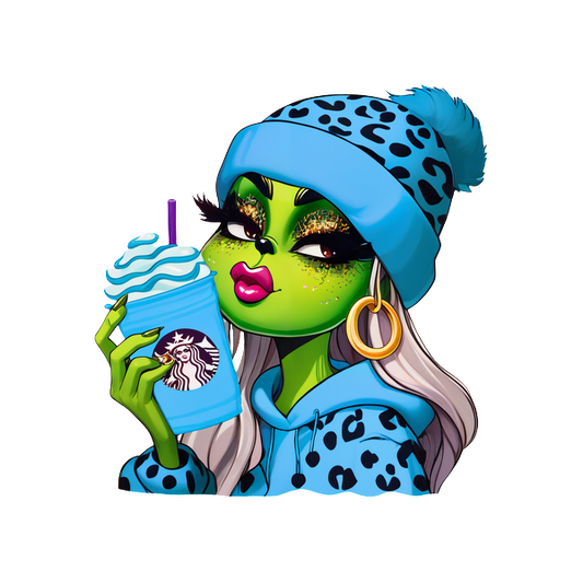 A stylish green character enjoys a Starbucks drink, wearing a blue leopard print hoodie and matching beanie.DTF Transfersdtf regular iron
