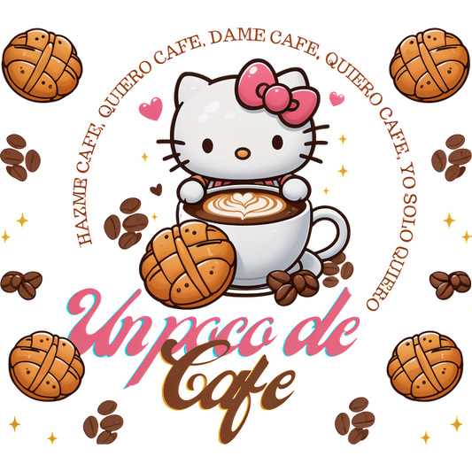 A cute illustration featuring Hello Kitty enjoying a cup of coffee, surrounded by coffee beans and sweet treats, with playful text.DTF Transfers dtf transfers