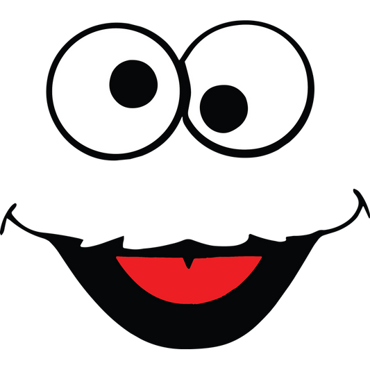 A playful cartoon face featuring large googly eyes, a red mouth, and a whimsical mustache.DTF Transfers heat press transfers