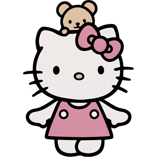 Cute illustration of Hello Kitty in a pink dress, adorned with a bow, with a small bear perched on her head.DTF Transfers heat press transfers