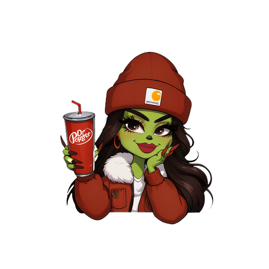 A stylish cartoon character with green skin, wearing a beanie, cozy jacket, and holding a Dr Pepper drink.DTF Transfers dtf prints