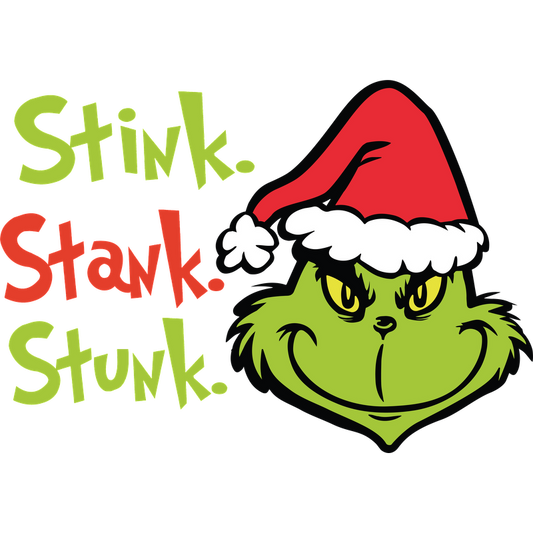 A playful design featuring the Grinch with the words "Stink. Stank. Stunk." in bright colors, perfect for holiday fun!DTF Transfers heat press transfers dtf prints
