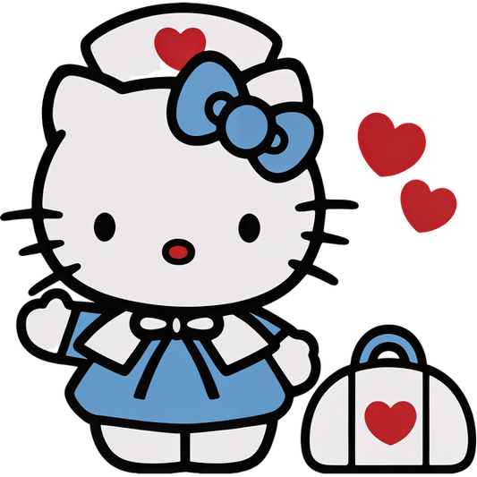 This adorable Hello Kitty character is dressed as a nurse, featuring a blue outfit and a matching bag with a heart.DTF Transfers