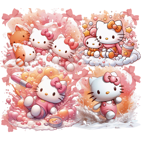 A colorful collection of adorable Hello Kitty illustrations featuring playful scenes with friends, bubbles, and sweet pastel colors.DTF Transfers dtf transfers