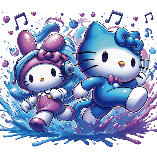 Hello Kitty and her friend are joyfully splashing through water, surrounded by musical notes, in vibrant, colorful outfits.DTF Transfersdtf regular iron dtf transfers
