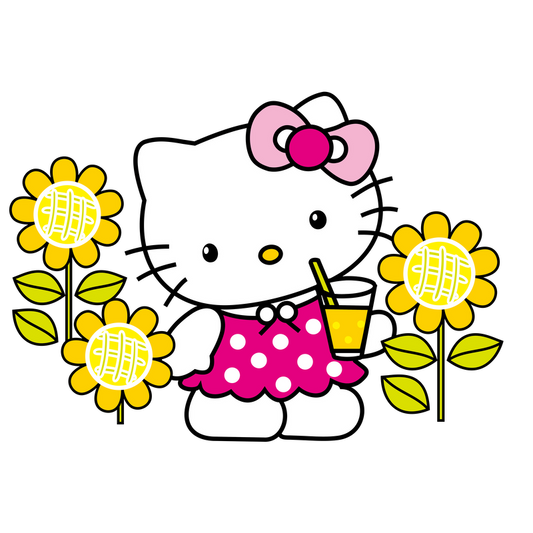 Hello Kitty, wearing a cute polka dot dress and bow, enjoys a refreshing drink surrounded by cheerful sunflowers.DTF Transfers