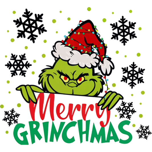 Celebrate the holidays with this playful "Merry Grinchmas" design featuring a mischievous Grinch in a festive Santa hat!DTF Transfersdtf regular iron