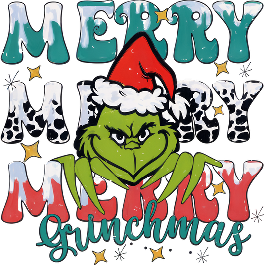 Celebrate the holidays with this fun "Merry Grinchmas" design featuring the iconic green Grinch in a festive Santa hat!DTF Transfersdtf regular iron