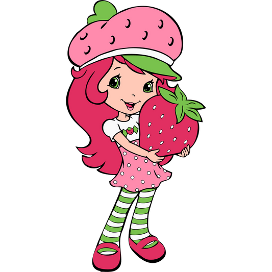 Meet a cheerful character with pink hair wearing a strawberry-themed hat, holding a big strawberry, dressed in colorful attire!DTF Transfers