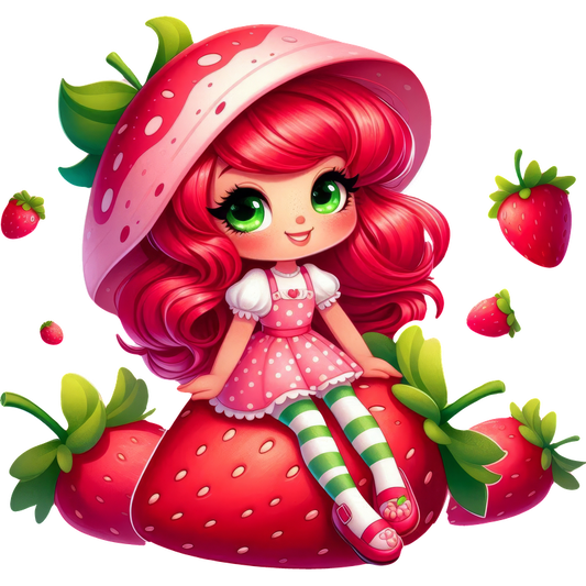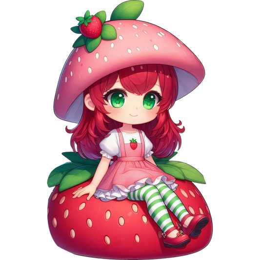 A cute, animated character with strawberry-themed attire and vibrant red hair, surrounded by colorful strawberries.DTF Transfers