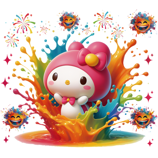 A playful character in a vibrant splash of colors, surrounded by festive fireworks and cheerful masks, radiating joy.DTF Transfers dtf prints