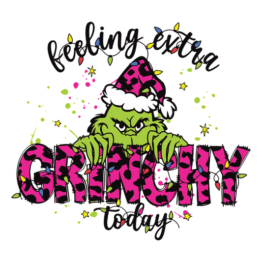 Whimsical Grinch illustration with festive lights, captioned "Feeling Extra Grinchy Today," perfect for holiday humor.DTF Transfers