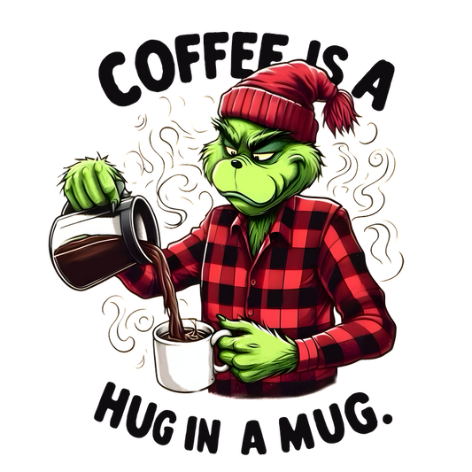 A whimsical illustration featuring a character resembling the Grinch, pouring coffee, with the phrase "Coffee is a hug in a mug."DTF Transfersdtf regular iron dtf prints