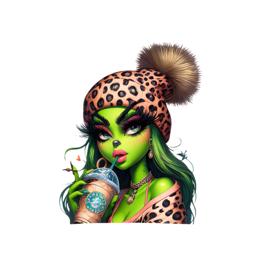 A vibrant green character in a leopard-print beanie enjoys a Starbucks drink, showcasing bold makeup and stylish accessories.DTF Transfers dtf prints