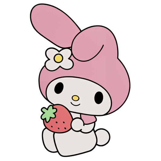 Prix habituel À partir de £0.75 GBPPrix habituelPrix unitaire / par£2.40 GBPPrix promotionnel À partir de £0.75 GBPCute My Melody character with a pink bunny hat, holding a strawberry and adorned with a white flower.DTF Transfers dtf prints