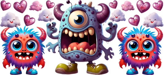A colorful and playful illustration of three adorable, furry monsters surrounded by hearts and fluffy clouds, exuding a fun vibe.UV Transfers dtf prints