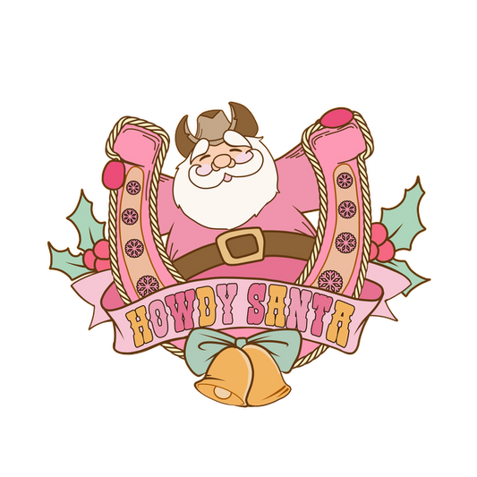 Cheerful cartoon Santa with a pink outfit and cowboy accents, surrounded by festive holly, featuring the phrase "Howdy Santa." heat press transfers